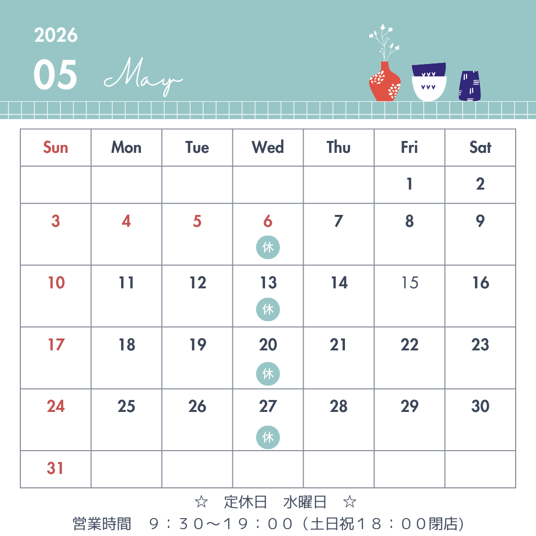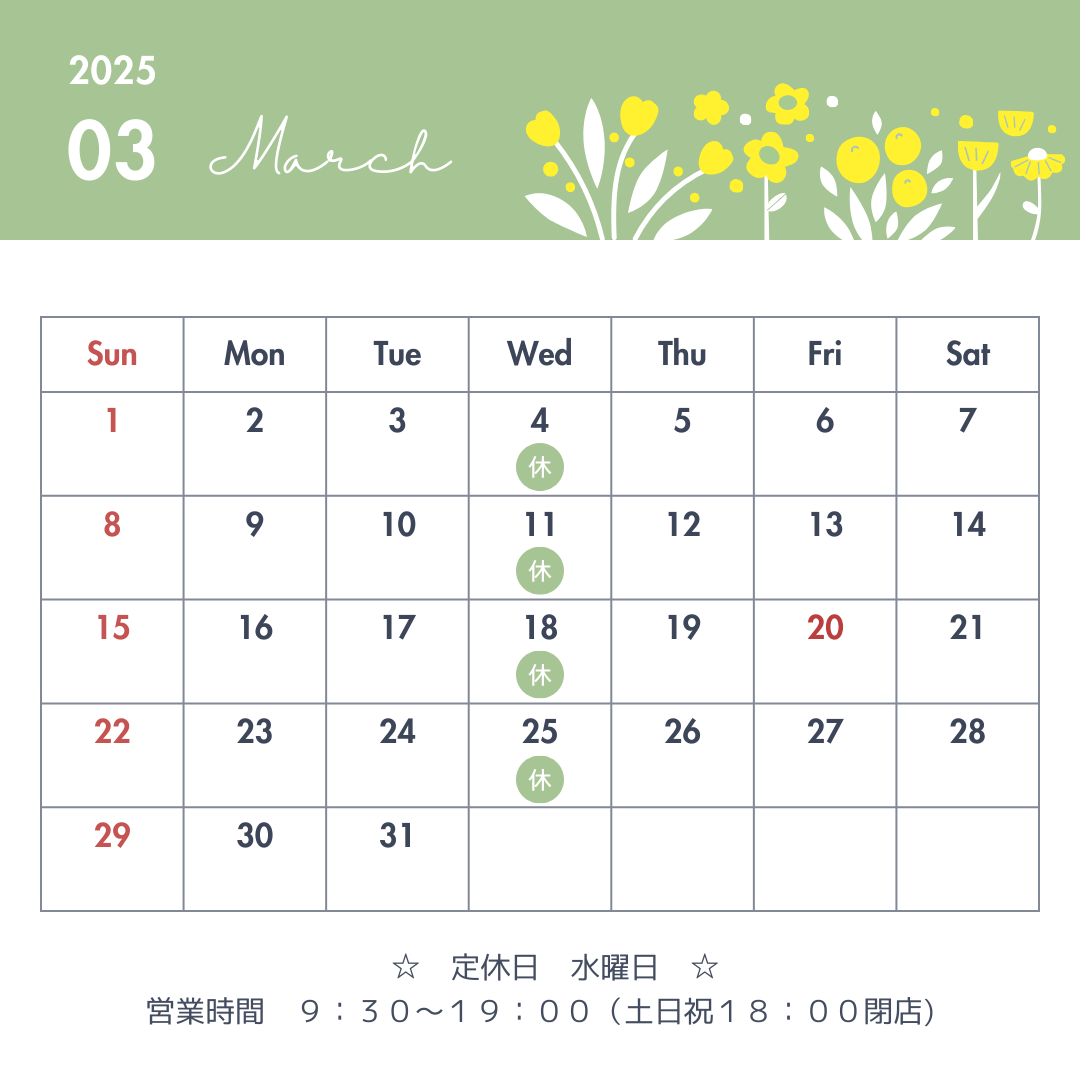 【営業時間】 9:30~19:00 (土・日・祝日のみ18:00閉店) 【定休日】 毎週水曜日 -